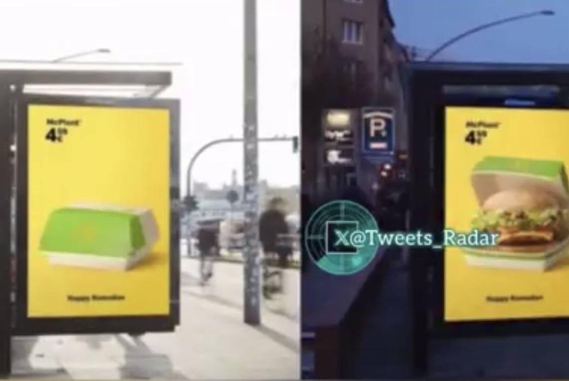 قدّمت سلسلة مطاعم ماكدونالدز هذا العام في ألمانيا إعلانات مبتكرة تزامنا مع شهر رمضان واحتراماً للصائمين، تعرض اللوحات الإعلانية عبوات طعام فارغة خلال ساعات الصيام، ليظهر الطعام عند غروب الشمس بتقنية متزامنة مع حركة الشمس.