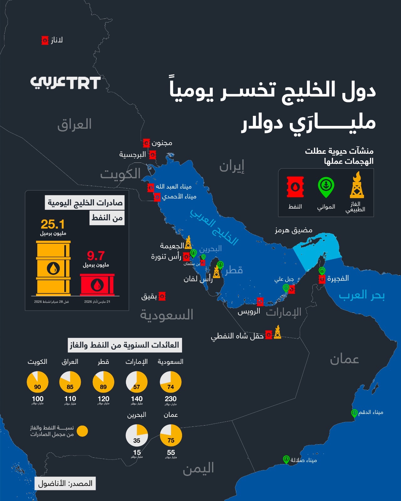 في زمن الحروب، لا تُقاس الخسائر فقط بعدد الضحايا أو حجم الدمار، بل أيضًا بالأرقام الصامتة التي تنزف يوميًا من الاقتصاد. اليوم، تقف دول الخليج والعالم العربي أمام واحدة من أخطر المعادلات: ثروة نفطية هائلة… لكنها مهددة في أي لحظة.